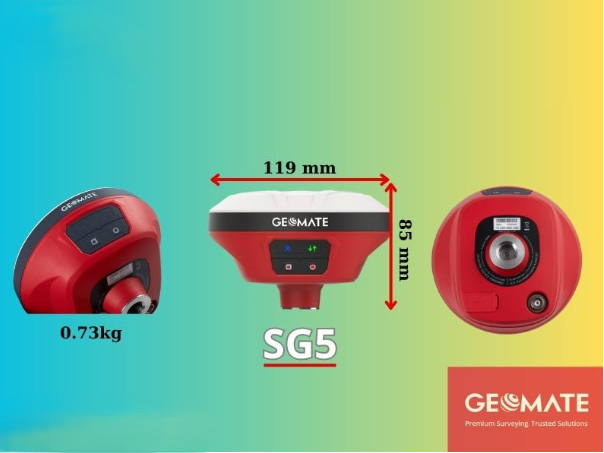 Máy GPS RTK GeoMate SG5 với thiết kế nhỏ gọn, khỏe khoắn và rất tinh tế. Kiểu dáng chỉ vừa vặn trong lòng bàn tay. Về ngoại hình, số đo tiêu chuẩn có nhiều điểm tương đồng với các máy CHC i73 hay EFIX F7. F7+. Kích thước chuẩn của máy GeoMate SG5 là: Φ119 mm x 85 mm (Φ4.69 in × 3.35 in). Trọng lượng rất nhẹ chỉ với 0,73kg rất phù hợp để đo khảo sát ở những nơi có địa hình khó, rừng núi.